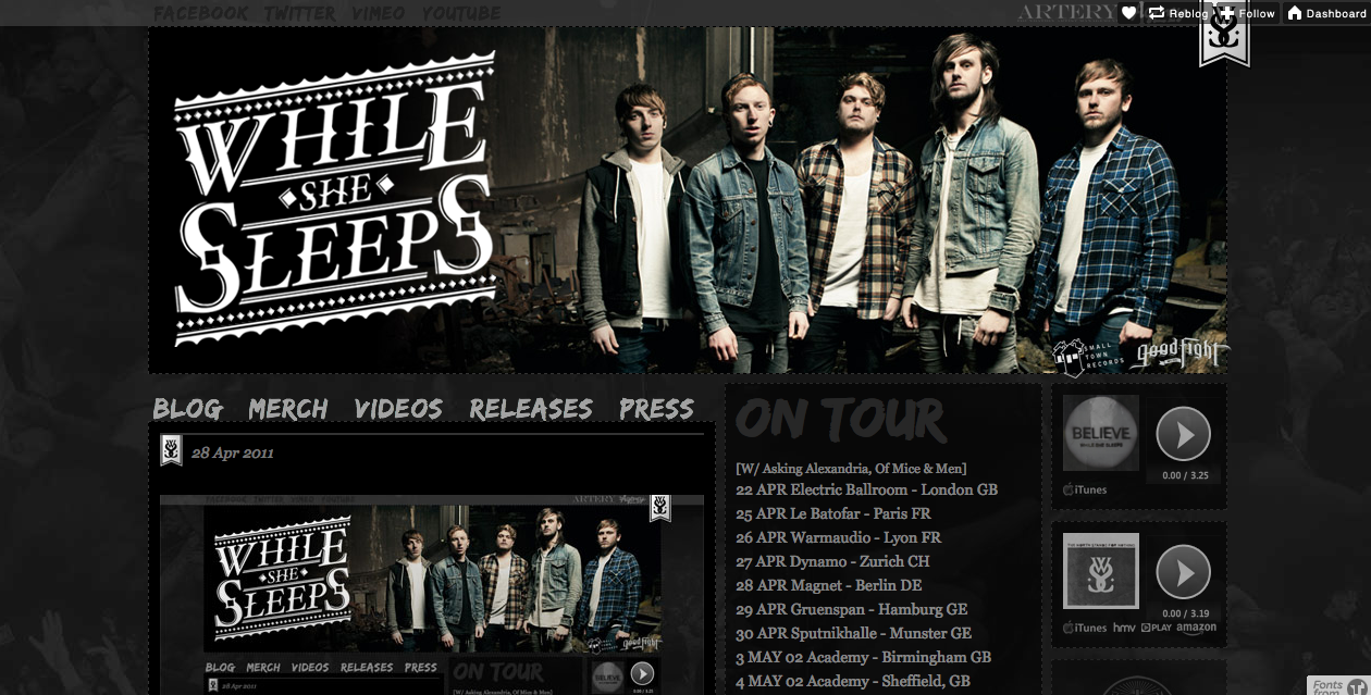 New While She Sleeps Website Posted on April 28, 2011 by legendsarising Leave a comment As my lovely girlfriend said: “imagine a LOVE button. then click it.” Looks good guys! http://wssofficial.com/ Share this: Click to share on Facebook (Opens in new window) Facebook Click to share on X (Opens in new window) X Like Loading... Related