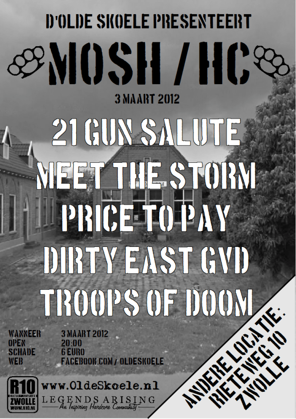 Support Your Local Scene: 21 Gun Salute, Meet The Storm & Price To Pay – March 3rd Posted on February 7, 2012 by legendsarising Leave a comment We’re happy to support this local show close to the town where we grew up, where hardcore started for us. Five bands, 6 Euros, March 3rd, Zwolle. Don’t miss out! Share this: Click to share on Facebook (Opens in new window) Facebook Click to share on X (Opens in new window) X Like Loading... Related