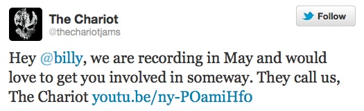 The Chariot To Record New Album Posted on February 20, 2012 by legendsarising Leave a comment The Chariot have announced that they’ll be getting back in the studio, to record the follow-up of 2011’s Long Live. They used the occasion to invite Smashing Pumpkins singer Billy Corgan to be a part of the album. Share this: Click to share on Facebook (Opens in new window) Facebook Click to share on X (Opens in new window) X Like Loading... Related