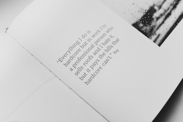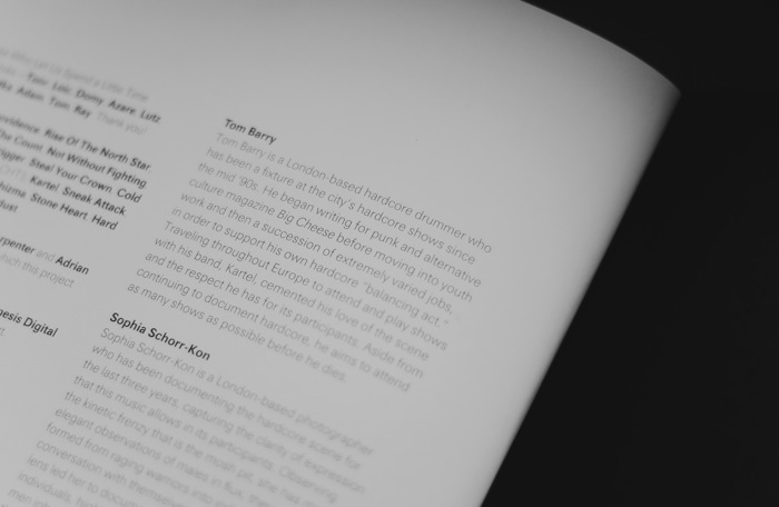 Tom Barry, drummer of London hardcore formation Kartel, teamed up with photographer Sophia Schorr-Kon, to capture the sheer intensity of hardcore shows, the harsh reality of paying bills, and the brotherhood that keeps this scene alive. With the intention to document the dedication of the new generation who keeps this tradition going, Barry thoroughly describes the lives of these individuals who found balance between the world of hardcore and work.