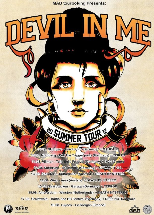 Italy’s hardcore outfit Devil In Me have announced a European tour later this summer. They will be joined on different shows by the likes of Terror, H2O, Madball, Sick of it All, Death By Stereo and Deez Nuts. See an overview of all shows and bands that will join them on stage below.