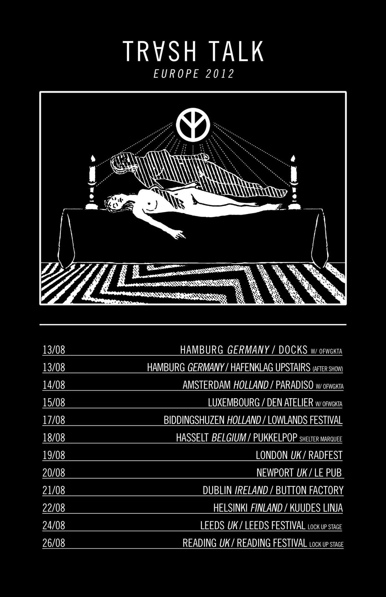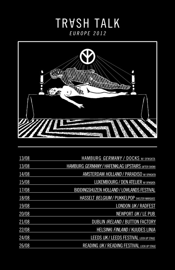 Trash Talk have announced a free show at the cafe of squatting movement Vrankrijk, reports Dutch website PodiumInfo.nl. As the poster shows that they play with OFWGKTA at Paradiso at night, the question still is when the band will play at Vrankrijk. The band will be kicking off their tour with hiphop collective OFWGKTA on August 13th to play some major festivals throughout Europe, and headline shows. See a full list of dates below.