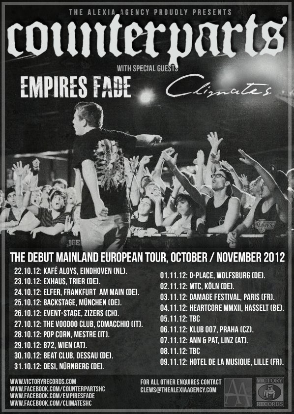 Counterparts Announce European Tour Posted on August 6, 2012 by legendsarising Leave a comment Hamilton, ON hardcore formation Counterparts have announced a European tour that’s planned for October/November. They’ll take Empires Fade and Climates with them as support acts. Find all dates in the tour poster below. Counterparts: Facebook / Website / Merch Share this: Click to share on Facebook (Opens in new window) Facebook Click to share on X (Opens in new window) X Like Loading... Related