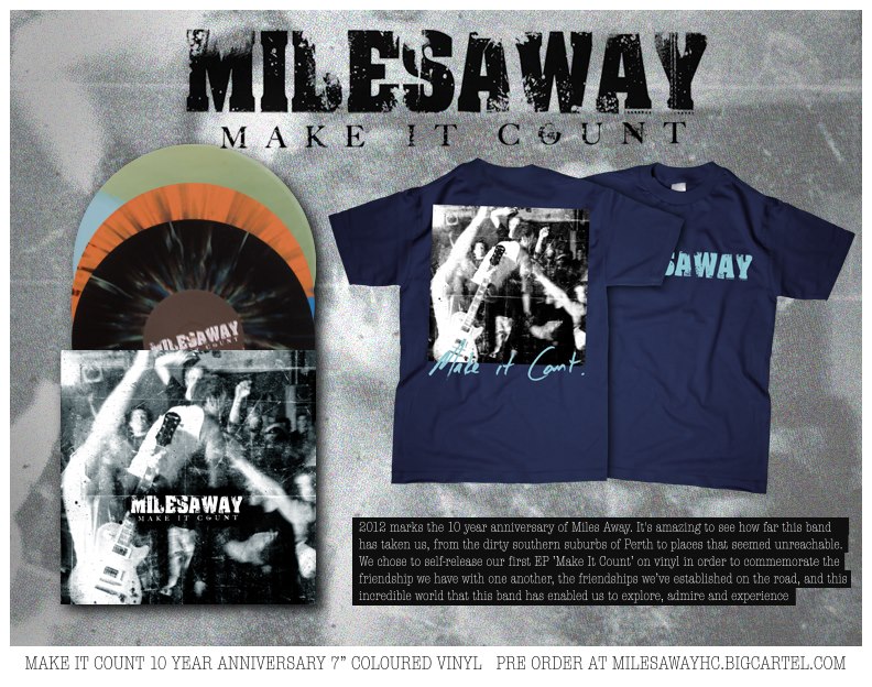 In celebration of their 10-year existence, Perth, Australia’s Miles Away have announced to release Make It Count on 10 inch vinyl. As stated on their Facebook-page, “there are three colours to chose from which have been individually picked by the consistent three members of Miles Away.”