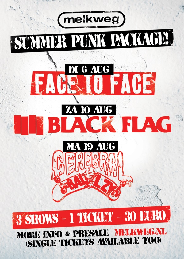 This summer, three grand Punk Rock acts are playing in De Melkweg, Amsterdam (NL). On August 6th Face to Face kicks off the summer package, the legendary Black Flag follows on August 6th, and Cerebral Ballzy rounds it up on August 19th. We’re collaborating with the venue to send two lucky readers to ALL THREE shows. And of course, you can take a friend. Head over to our Facebook-page, find the poster, TAG yourself in it, and make sure to SHARE it on your wall. The winners will be announced a week before the first show.