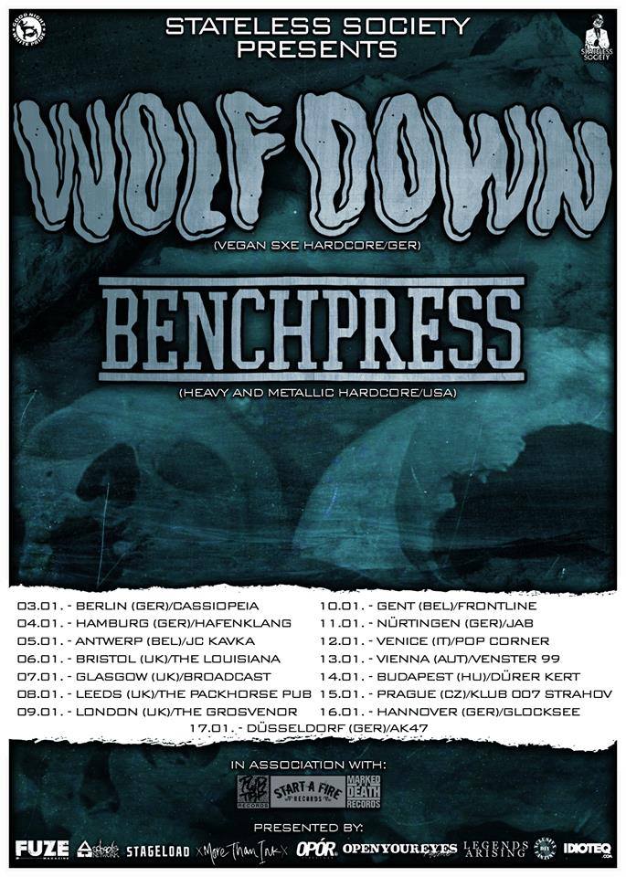 We’re proud to present Wolf X Down on tour in Europe with Benchpress in January 2014. The bands are kicking of their tour at Berlin’s Cassiopeia, which takes them through eight countries in two weeks. Make sure to get down to a show near you to support both bands.