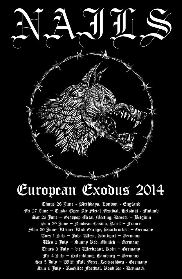 Better late than never, as the saying goes. Heavy hardcore and metal outfit Nails from California will be touring Europe this summer. They’ll be playing at bigger festivals such as Graspop Metal Meeting (BE) and Roskilde Festival DK), but also a fair amount of club shows. See the full list of dates below: