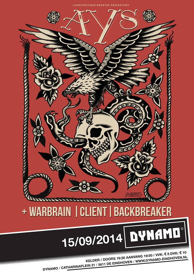 AYS is playing a show at Dynamo in Eindhoven (NL) on September 15th with Warbrain from Australia and Client from Germany. Local band Backbreaker will be opening up. We’re giving away 2×2 tickets, so you know the deal: head over to our Facebook-page, FIND the above poster, TAG yourself in it and SHARE it on your wall. The winner will be announced in the first week of September. GO!