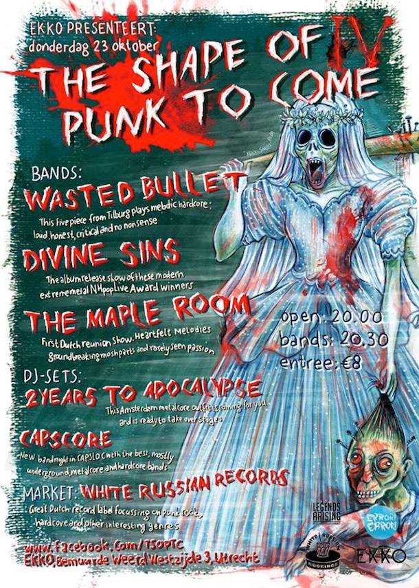 Utrecht-based (NL) initiative The Shape of Punk to Come has announced its fourth edition. The young organization strives to present the best local bands on a quarterly basis and always invites a label or band to do a DJ-set. On October 23rd, Wasted Bullet is on top of the bill. Divine Sins will be releasing their new album and The Maple Room from Belgium will play their very first reunion show in The Netherlands. White Russian Records will be present with their distro and we’ll be selling The L.A. Journal #1. Come hang out!